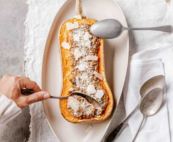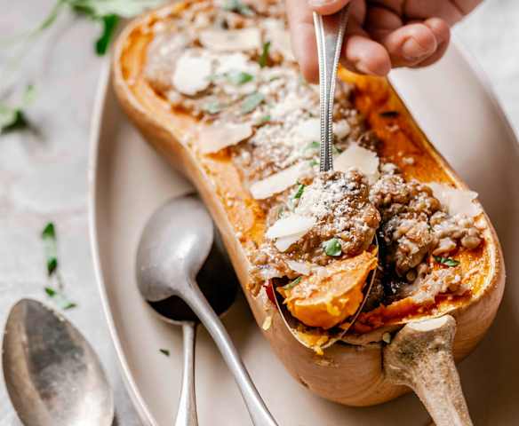 Courge farcie au risotto d'épeautre crémeux et champignons