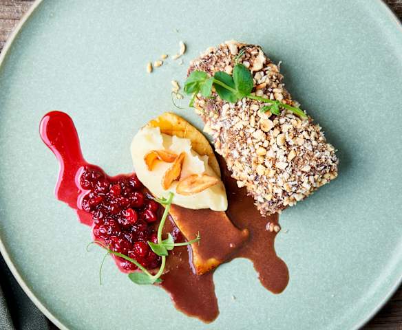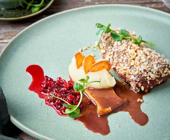 Filet de cerf, purée de panais et pommes de terre, chips de carottes, eryngii, canneberges